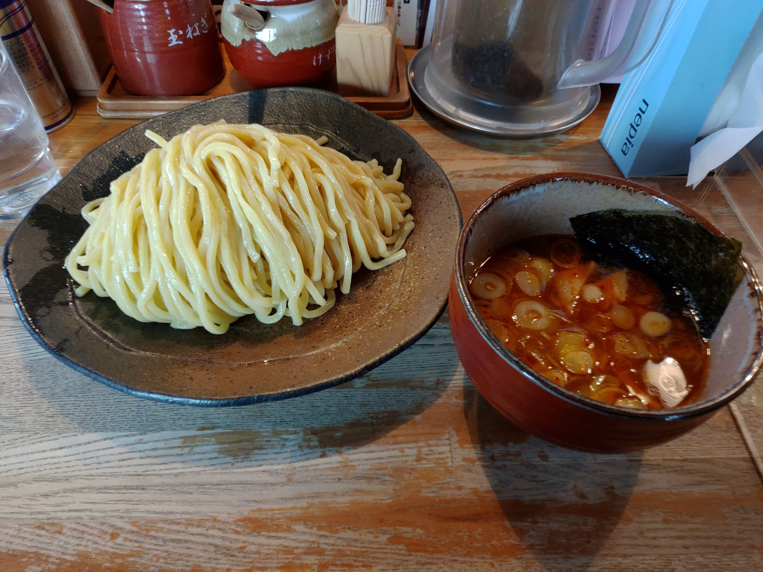 辛つけ麺で麺の量は問わず860円。中盛りをオーダーの予定が、食欲には抗えず大盛りをいってしまいました苦笑